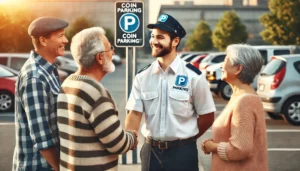 DALL·E-2024-08-06-14.52.53-A-friendly-scene-of-a-parking-lot-management-company-employee-interacting-positively-with-local-residents-near-a-coin-parking-lot.-The-employee-is-wea