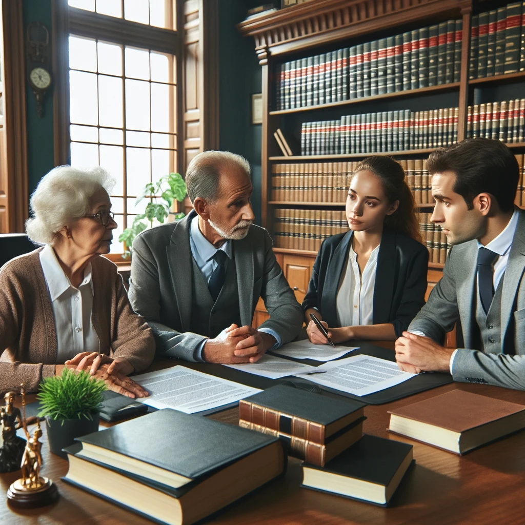 DALL·E 2024-04-25 13.58.47 - A scene in a lawyer's office where a family is discussing inheritance issues. The room is traditional and professional, with a large wooden desk, lega
