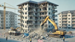 DALL·E-2024-09-05-14.37.17-A-detailed-photo-realistic-scene-of-a-two-story-apartment-building-being-carefully-demolished-with-heavy-machinery.-The-excavator-with-a-hydraulic-ar