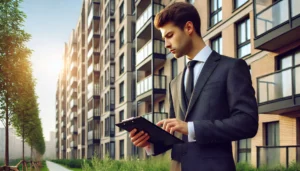 DALL·E-2024-09-05-14.48.23-A-realistic-photograph-quality-image-showing-a-professional-real-estate-agent-inspecting-an-apartment-building.-The-agent-is-wearing-business-attire-