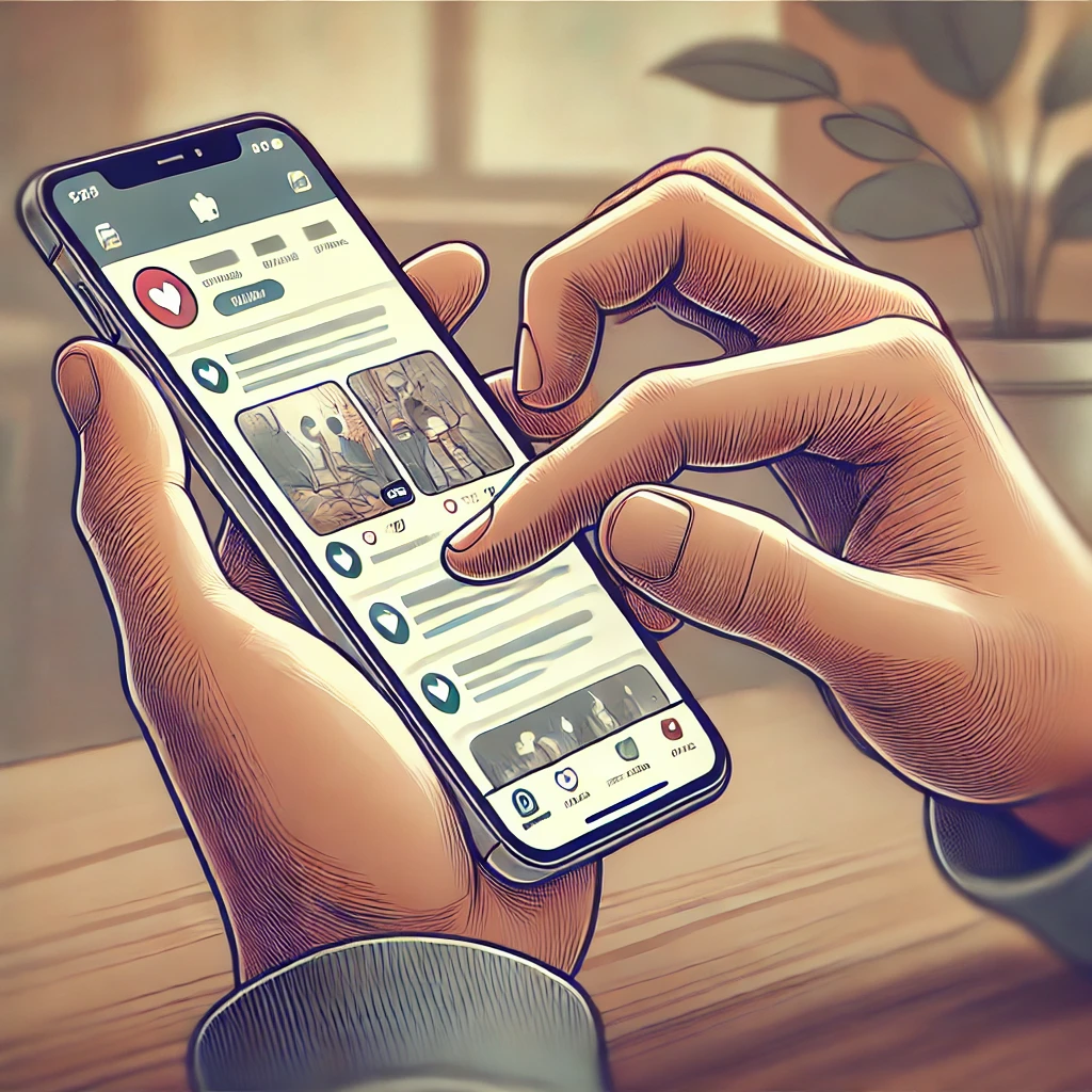 DALL·E-2024-08-16-11.08.58-A-close-up-illustration-focusing-on-the-hands-of-a-person-checking-social-media-on-a-smartphone.-The-hands-are-holding-a-modern-smartphone-with-a-soci-1