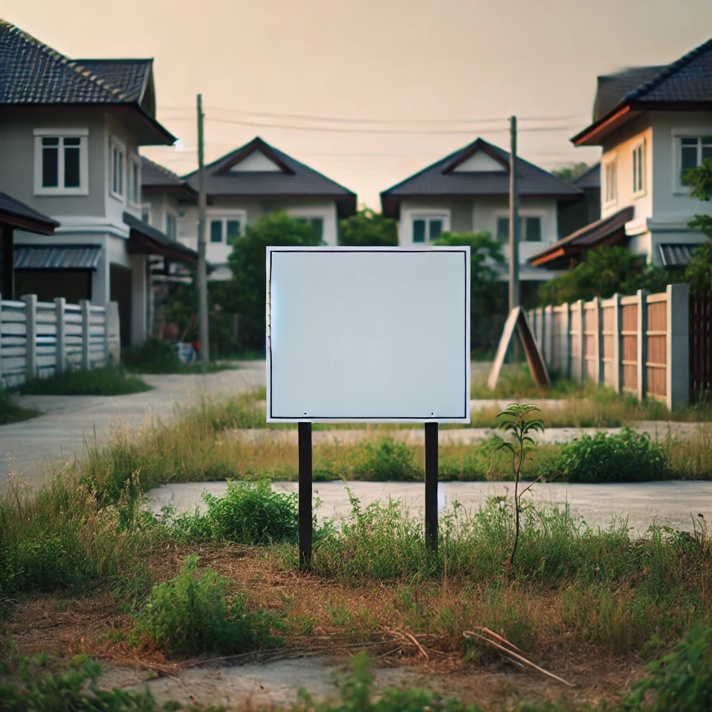 DALL·E-2024-08-16-11.11.13-A-quiet-residential-neighborhood-with-a-vacant-lot-in-the-center.-In-the-middle-of-the-lot-there-is-a-single-white-blank-signboard-standing-alone.-T